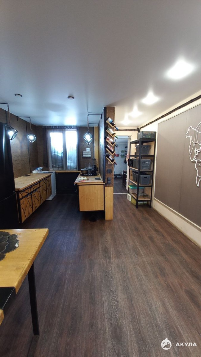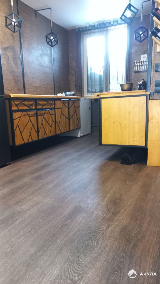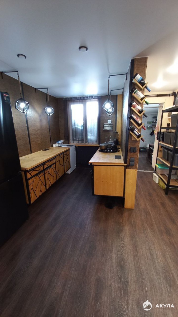 парящая кровать , кухонный гарнитур сделан на заказ из цельного массива , кухонный стол также сделан из цельного массива дерева. Вся мебель в стиле лофт